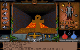 Chant the mantra insahn at a shrine and the shrine will tell you the direction from that shrine to the room of the cup. You can repeat this on each level and each shrine. You will reach the room with the cup in the northwest of level 3 (L3: (21)) at last. Unfortunately this place looks empty (hope you have killed the gazer already).